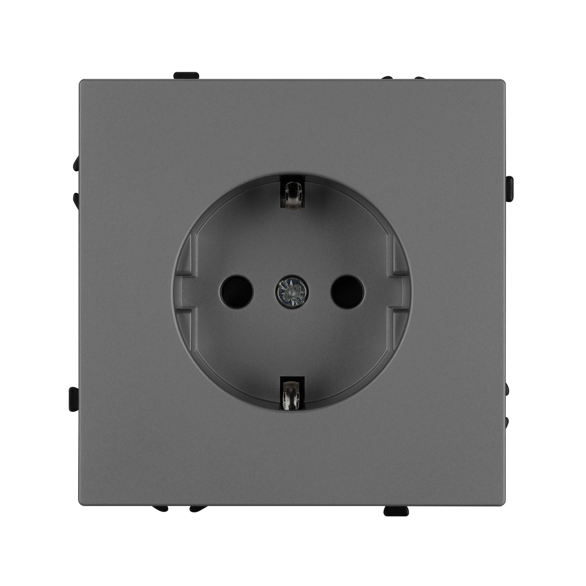 Механизм розетки с заземлением на 1 пост. Цвет - серый, с Soft-Touch покрытием. Без фронтальной рамки. Уровень пылевлагозащиты IP20. Розетка устанавливается в стандартный подрозетник круглого сечения диаметром 60мм.